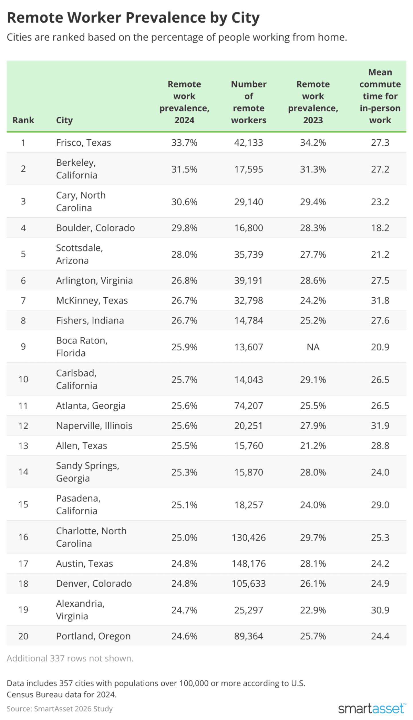 - One-third of workers are remote in Frisco, Texas. Frisco remains the top city for remote work with 33.7% of workers aged 16 and up working from home, despite a slight decline from 34.2% a year earlier. The rest of the top five saw slight to moderate increases in remote work year over year, including Berkeley, California (31.5%); Cary, North Carolina (30.6%); Boulder, Colorado (29.8%); and Scottsdale, Arizona (28%).